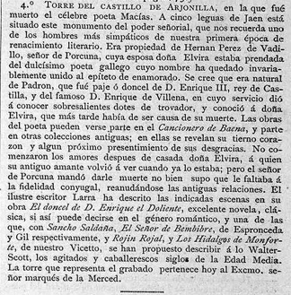 En su página 83 publica un texto referido al castillo arjonillero donde tuvo lugar el triste desenlace de la historia de amor de Macías y Elvira. Hechos en los que se confunden la historia con la leyenda pero existiendo elementos que parecen demostrar la existencia de estos hechos en nuestro histórico castillo. Próximamente os presentaré un documento que invita a pensar que se trata de una auténtica historia.
