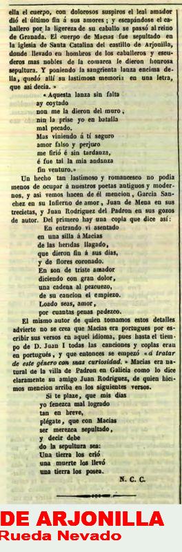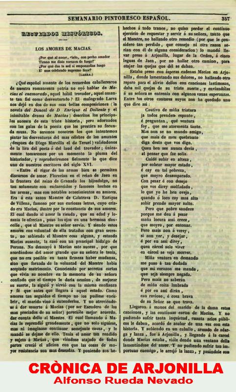 El Semanario Pintoresco Español en su número 45 publicado el 10 de noviembre de 1844 en su sección Recuerdos históricos publica un artículo con el título “Los amores de Macías”, en el que narra la historia de nuestro ilustre trovador, conocido como “Macías el enamorado”.