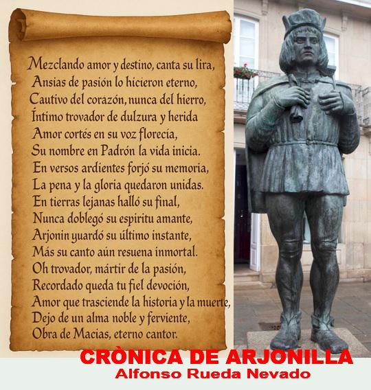 Y dado que estas Jornadas Medievales van a estar marcadas por la visita de los representantes del pueblo natal de Macías, Padrón, les dedico este acrónimo con el nombre por el que allí es más conocido popularmente “MACÍAS EL ENAMORADO”. El texto ha sido creado también por la IA, al que le he añadido una imagen del Macías que figura en la Plaza de Macías en Padrón.