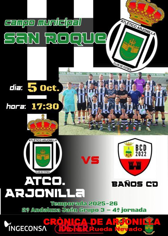 Este próximo domingo 5 de octubre a las 17:30 horas en el Municipal San Roque se enfrentarán el Atco. Arjonilla CF y el Baños CD, en partido correspondiente a la 4ª jornada de la Segunda Andaluza Jaén Grupo 3.