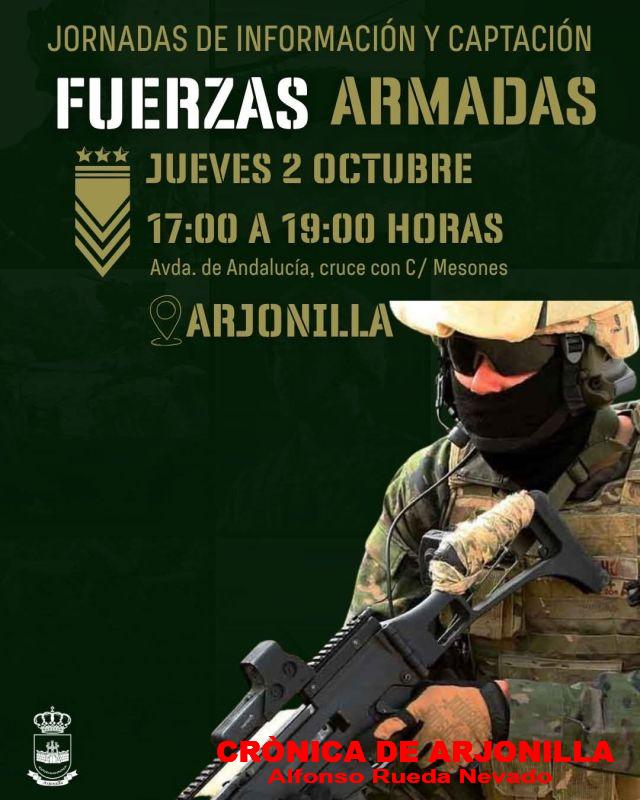 Mañana jueves 2 de octubre las FUERZAS ARMADAS llevarán a cabo en Arjonilla unas Jornadas de Información y Captación, encaminadas a que los jóvenes opten por formar parte de las mismas.