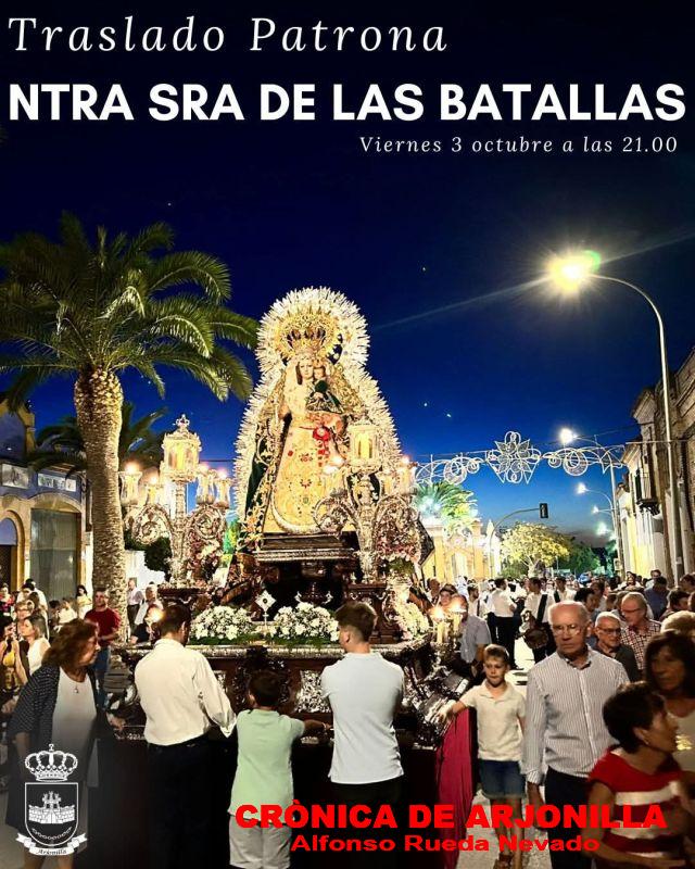 El Ayuntamiento de Arjonilla informa que pasado mañana viernes 3 de octubre se procederá al traslado de nuestra Patrona la Virgen de las Batallas desde su sede (Ermita de San Roque) hasta el templo parroquial de Ntra Sra de la Encarnación.